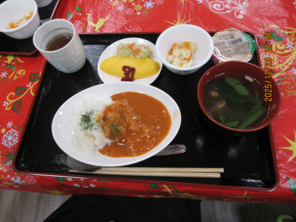 クリスマス会の昼食で少し豪華な食事を楽しみました。